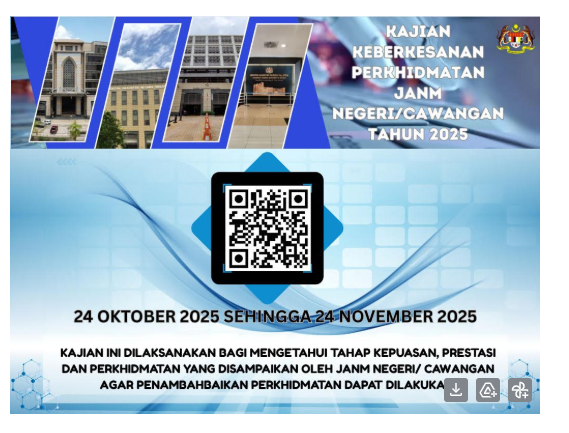 2. Dimaklumkan bahawa satu Kajian Keberkesanan Perkhidmatan JANM Negeri/Cawangan Tahun 2025 akan diadakan bermula 24 Oktober 2025 (Jumaat) sehingga 24 November 2025 (Isnin). Sehubungan itu, mohon kerjasama tuan/ puan di PTJ/Pejabat Pemungut/Pusat Gaji/Pusat Terimaan untuk menjawab kajian ini. Kajian ini bertujuan untuk mengetahui tahap keberkesanan perkhidmatan serta cadangan penambahbaikan yang bersesuaian untuk dilaksanakan di JANM Negeri/Cawangan termasuk Bahagian Akaun Kementerian Kewangan (BA MOF).Tuan/puan boleh menjawab kajian ini melalui link dan QR Kod Kajian Keberkesanan Perkhidmatan JANM Negeri/Cawangan Tahun 2025 adalah seperti berikut: https://forms.gle/nRucDy3CwgPgXz2n6